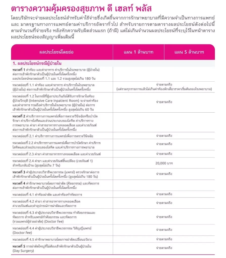 – เหมาจ่ายค่าห้องและค่ารักษาพยาบาลเหมาจ่ายตามจริงครั้งละ 5 ล้านบาท ไม่จำกัดครั้งต่อปี