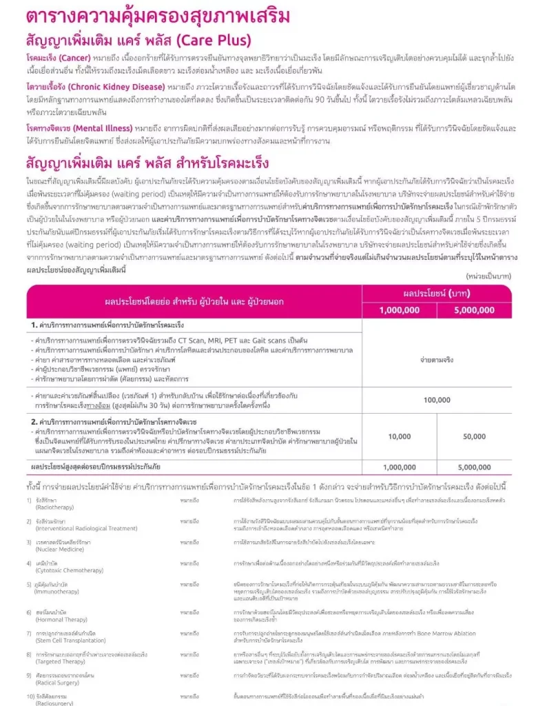 – ไม่คุ้มครองค่ารักษาพยาบาลโรคมะเร็งและไตวายเรื้อรัง ทั้งผู้ป่่ีวยในและผู้ป่่วยนอก แต่สามารถซื้อความคุ้มครองแคร์พลัสเพิ่มเติมได้